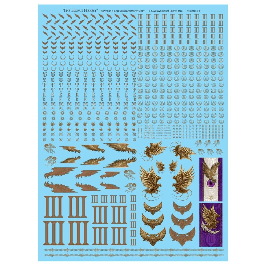 This A4-sized sheet contains 652 high-quality, full-colour waterslide transfers – more than enough for all but the largest Legiones Astartes forces. These transfers allow you to easily customise your miniatures with detailed imagery, specifically designed for the Emperor’s Children Legion. The sheet features accurate Legion icons and numerals, company markings, and squad designations, as well as a variety of decorative insignias, honours, large vehicle badges, and banner art for your Emperor’s Children army – including ornamental gold filigree, the resplendent Palatine Aquila, elegant proficiency symbols, and gilded glyph-forms for specialists such as Kakophoni and Palatine Blades.